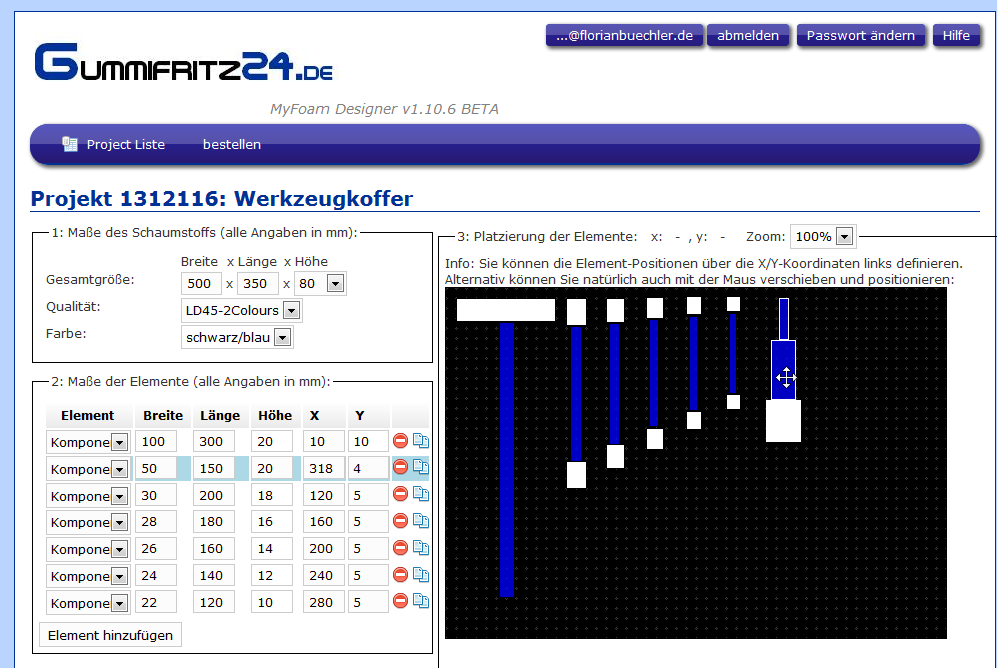 Mit dem myFoam Designer können Endkunden individuelle PE-Schaum-Zuschnitte gestalten und online bestellen, z.B. Werkzeugkoffer- oder Kamerakoffer-Inlays, Modellbau-Schaumstoffaussteller, Geschenkartikel-Boxen, medizinische Instrumente und viele weitere Anwendungsfälle - sprechen Sie uns einfach an unter Telefon 0821 2671 9209.